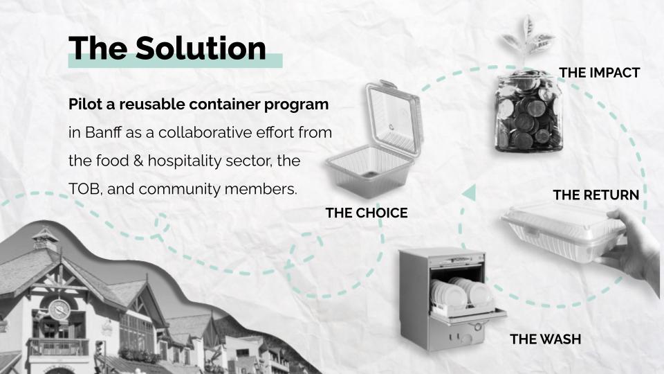- Convinced 8 local businesses, the Town of Banff, and 20+ community volunteers to participate in a reusable container pilot program