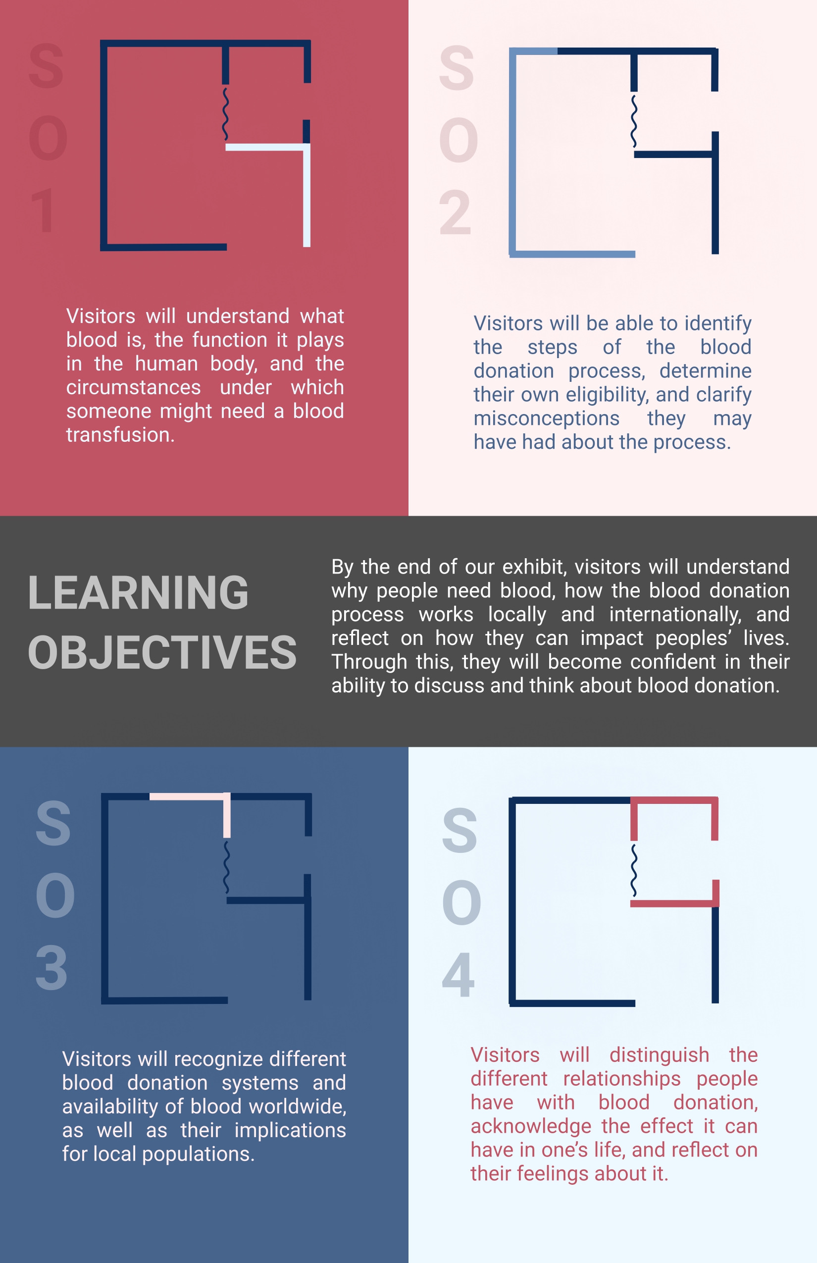 - Curated interactive elements: blood-type puzzles, global blood collection quiz, "would you donate?" wall, donation immersion